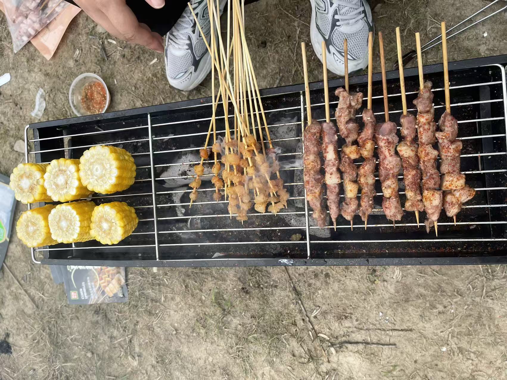 周天又和这群同事约了去户外露营烧烤,在一个叫康门水库的地方,我们在这露营得有4、5次了。这里现在也开始收停车费了,看来有了流量哪都逃不过商业化。停车收费就算了,钓鱼也不能掉了,以前还能在这钓钓鱼虽然是空军了,明火也不让烧了,烟稍微大点就有大爷来让我们灭掉,不过还好也没那么死板,还是愉快的烤完了。倒是有些明火烧锅炉的,被拎着灭火器的大爷死守着不让烧,也算是替我们分担了一些火力。这次我们来了7个人同事和同事对象们,以前十几个人的时候更热闹,户外露营就是得人多才有趣。人多装备也多,场地搭建快,组装桌椅,拉天幕,生炭火烤肉,准备其他吃的,最后散场收拾物品清理垃圾人多干活也快,当然得大家一起做事,都在动都在忙活还是团结有氛围的。吃烧烤零食,畅聊公司八卦,打牌抽烟,吊床摇摇乐,舒服惬意,一群合得来的人也是难得,所以我和甜宝也乐意参与。