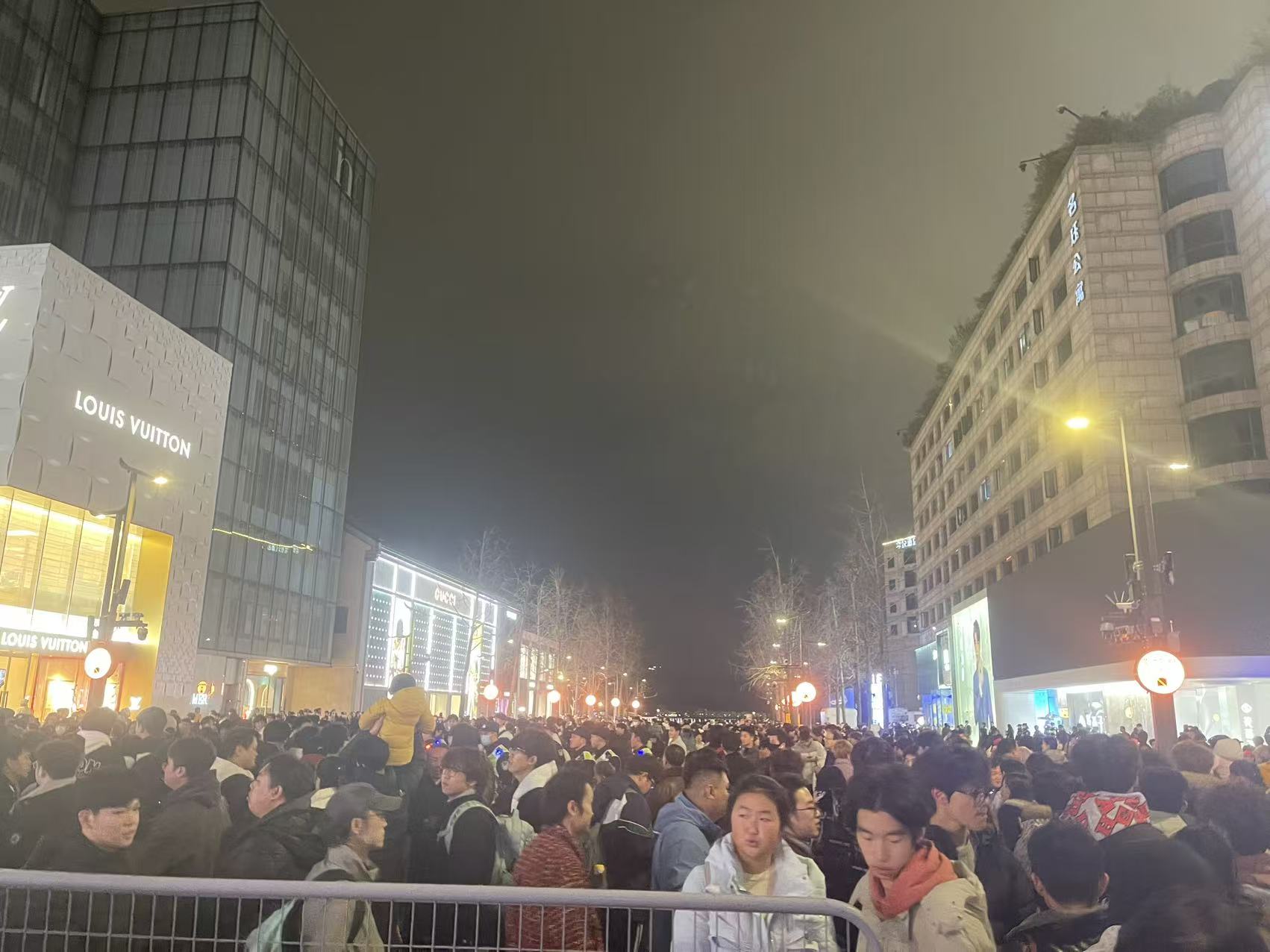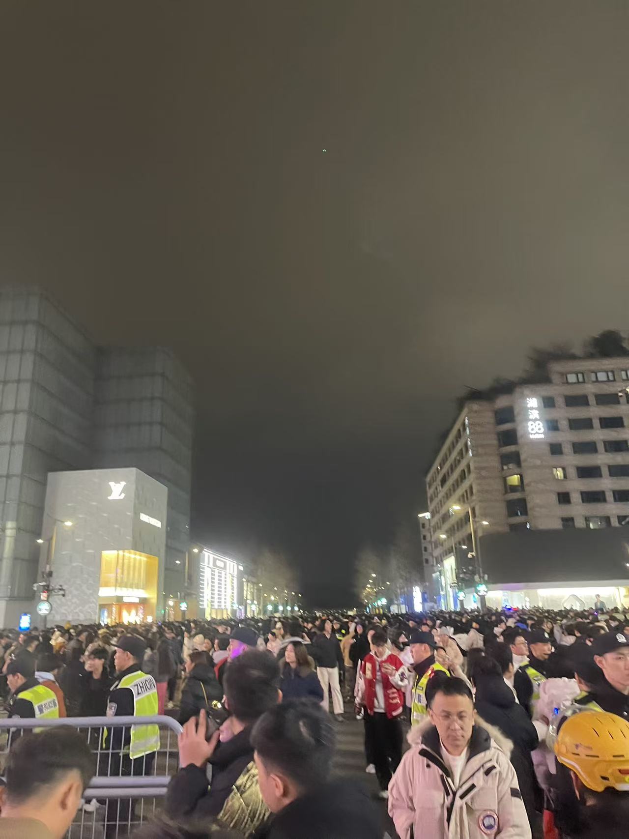 西湖,从来不缺人气,跨年这么特殊的日子,人流量自然比旅游旺季还多。冬天的夜晚站在湖边,冷风一吹一个激灵,匆匆看了两眼就去商场逛了起来。因为跨年夜的缘故,从in77商场周边到西湖周边多了非常多的警察和安保人员,也用围栏分割了很多区域,多了些指定的进口和出口,可能是为了安全考量,不懂其中控流的意义,只觉得有些绕路。in77和工联cc这个十字入口,志愿者们手拉手围起了人墙,利用斜包的方式让人和车在对应的红绿灯下能正常通行,避免混行冲突,这点还是非常棒的。这周边商场外墙是有几块大屏幕的,很多人期待着大屏幕能够在快到0点的时候有倒计时,但恰是因为人多所以全关了,非但如此,卖气球的也没有了,禁止放飞气球成了共识,管控的非常严格(去年跨年夜在湖滨in77这里有气球被点燃)。