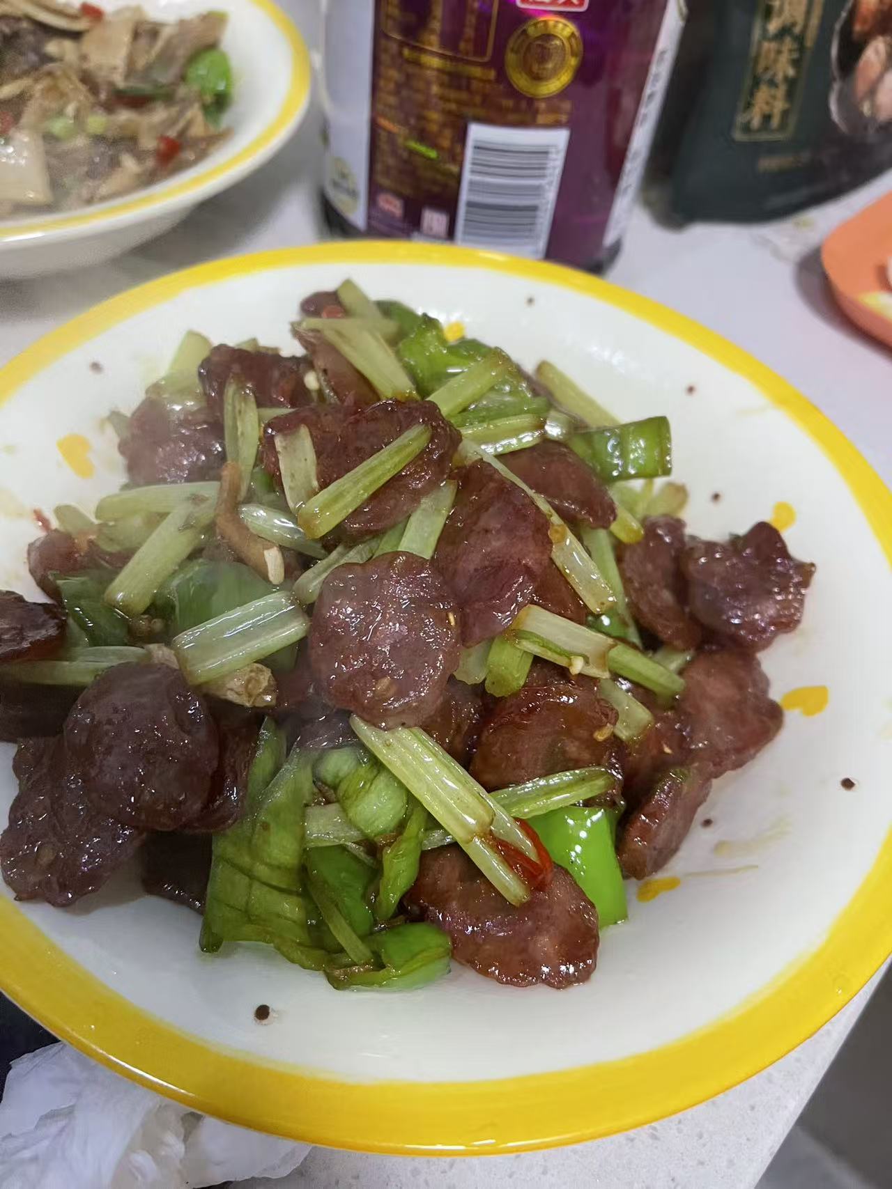 芹菜辣椒炒腊肠,近期做了两次腊肠这是五香版的,相比较清蒸我更i这样炒