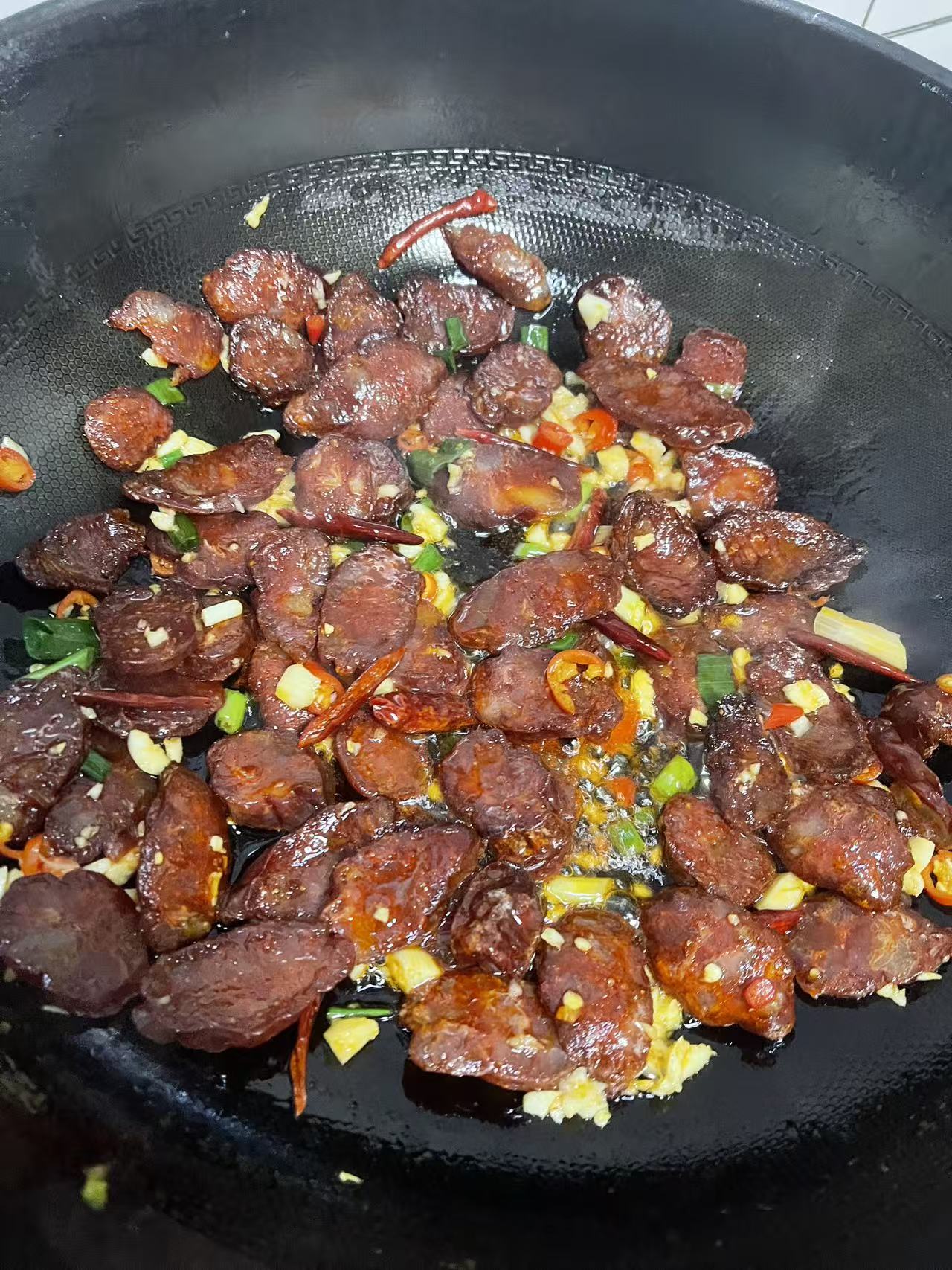 炒腊肠,香辣版腊肠,和五香版相比这个多了辣味,初尝一般越吃越想,也还不错
