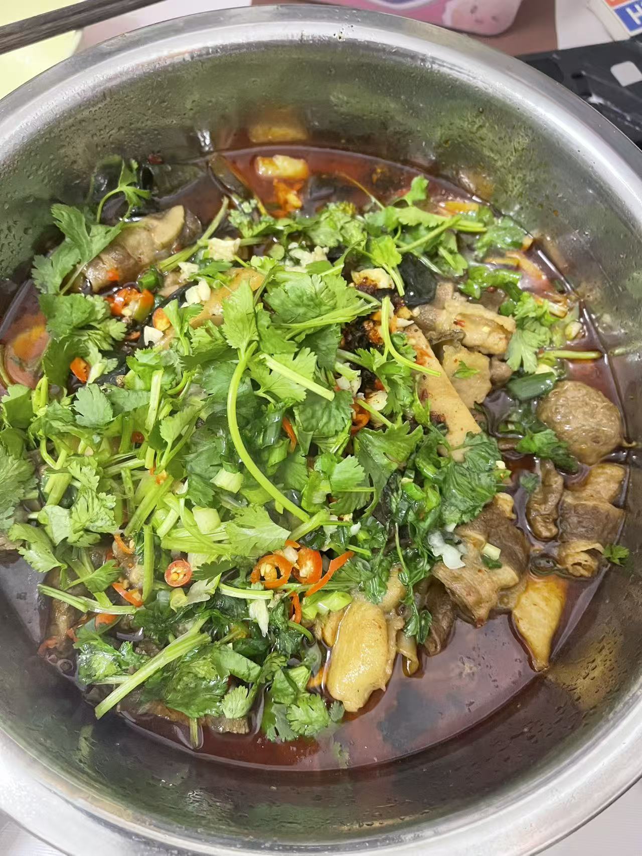 冒菜,火锅底料豆瓣酱炒香下水配调料然后煮菜,最后葱蒜花椒干辣椒泼油,美味已成