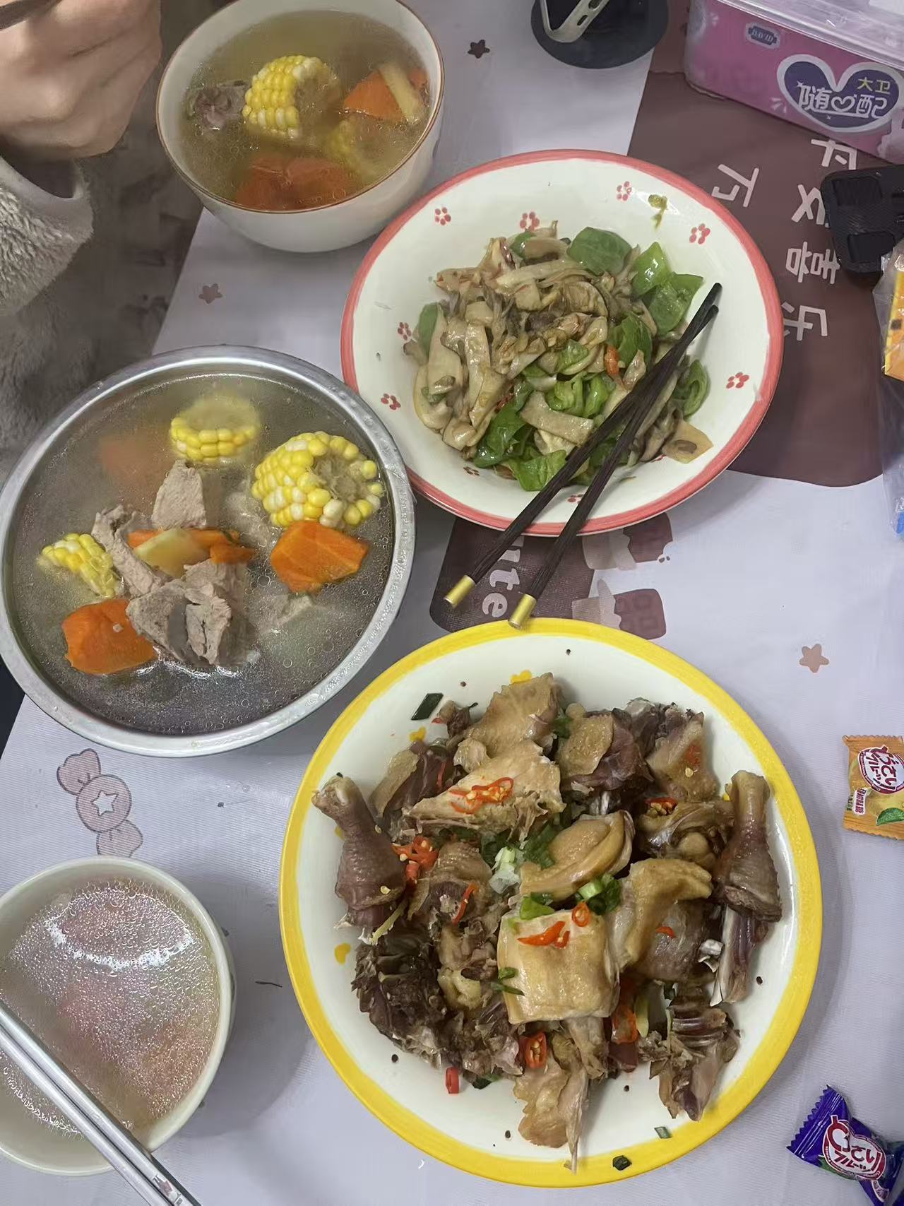 玉米排骨汤(简单美味)、清蒸风干鸡(在抖音买的湖北特产,放了几周终于是吃了,我挺喜欢吃这种口味的鸡,很香带骨头的好吃,纯肉反而差点感觉)、清炒菌菇(三种菌菇组合,炒起来爆香,很美味,最近做了好几次)