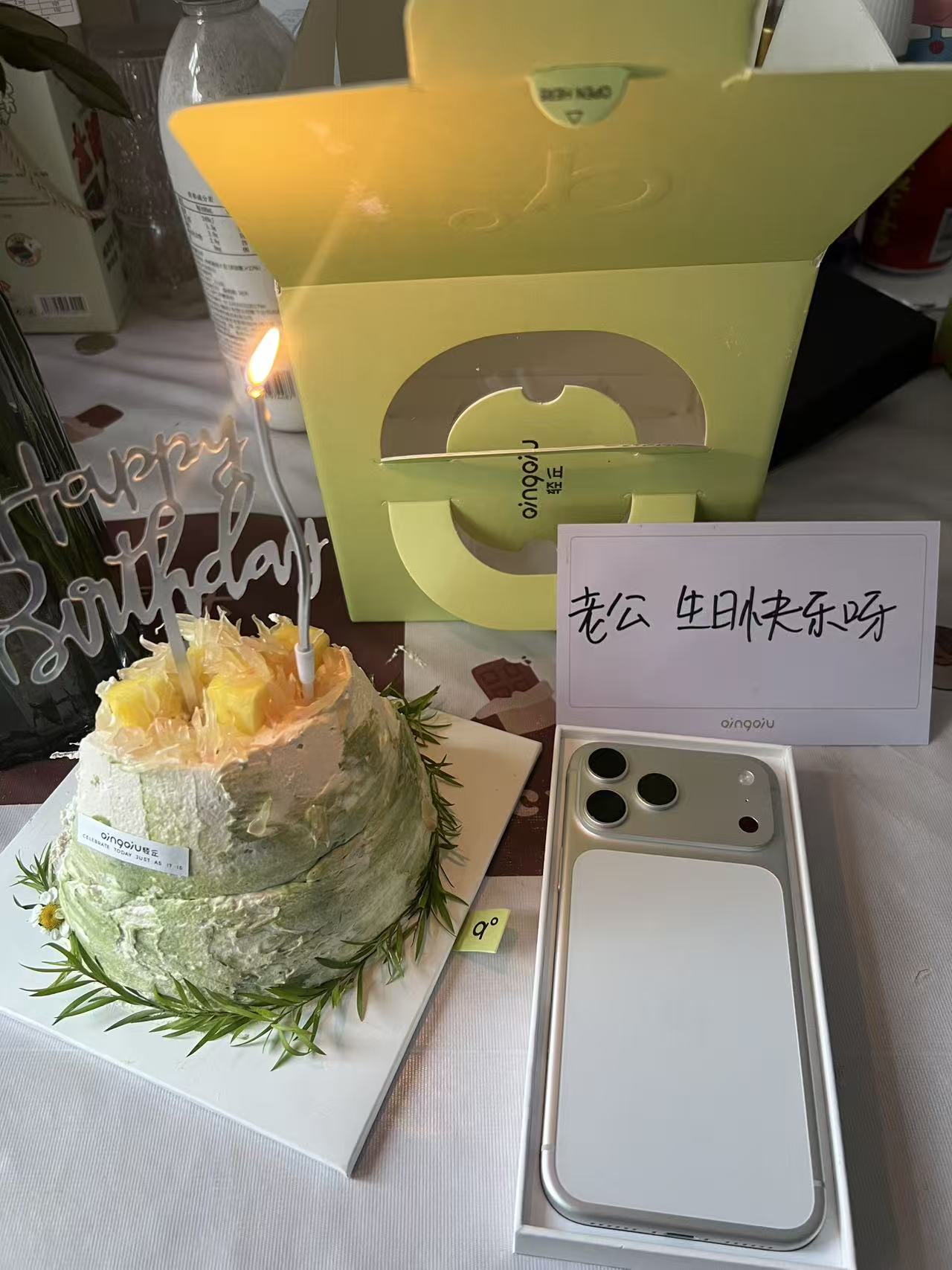 认识甜宝以来,我的每一个生日她都很重视,也是认识她之后生日才有了原本的样子,蛋糕、礼物、仪式感都是她给的,感谢有你哦~ 今年是她陪我过的第5个生日,真好。每年都要想不一样又得有意义的生日礼物也挺耗费心力吧,毕竟还有很多其他节日纪念日-<-。这次生日甜宝送了我一个手机,iPhone17 promax,512g的11999元,贵是真的贵,用也确实好用。虽然心疼钱但是更感谢媳妇的爱,原手机是12promax 当时也花了小一万买的,用了4年多,还是很好用,就是后盖碎了换了一次之后又碎了只能套壳使用,偶尔出去没有信号付钱都不付不了(有一次尴尬死了,一个人出去买了张刮刮乐最后还是蹭人饭店的wifi结的账)然后256的内存实在是不够用老要清空间,还有就是电池健康降到了75一天得充三回电..这么一想,也确实该换了,但是又能用就舍不得换,媳妇知道这些毛病,心疼我给我换了个更好的,真是大爱,嘻嘻。除了礼物,媳妇还准备了个很好吃的蛋糕,真是有心了。礼物蛋糕还是背着我偷偷买的,真是给了我一个大大的惊喜。生日过完,也预示着我又大了一岁咯!