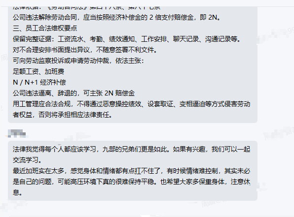 最近感受到公司的整体氛围变了,之前还传出要裁员,今天公司大群有个人扛不住发了一些劳动法规,暗示公司和领导遵纪守法。估计也是被逼无奈吧,我们吃瓜觉得是要裁人还不愿意给人n+1。这就是公司格局不行,明明股票去年翻了好几倍,领导们应该是赚翻了,但是所谓的降本增效下来就是对员工各种压榨,取消了很多福利待遇。当然,忍不了的早就离职了,至于没走的那就理由太多了。就拿我们部门来说大部分都成家有娃了,有的还有房贷,加上现在工作不好找等等轻易是不会离职的,最重要的是舒适区待久了想动一动确实需要极大的决心,还没到那一步吧。没有房贷没有生娃的可能也没有存款没有足够厉害的技术担心找不到更好的,那不如就这样苟着。而我则属于还能接受目前的薪资,去年的年终也算多的,小部门氛围非常好,加班对比整个行业来说其实也还好?不过这是因为我不愿内卷,无谓加班做样子谁不会,奈何家里还有人等着,我就总想早点下班早点回家呀。